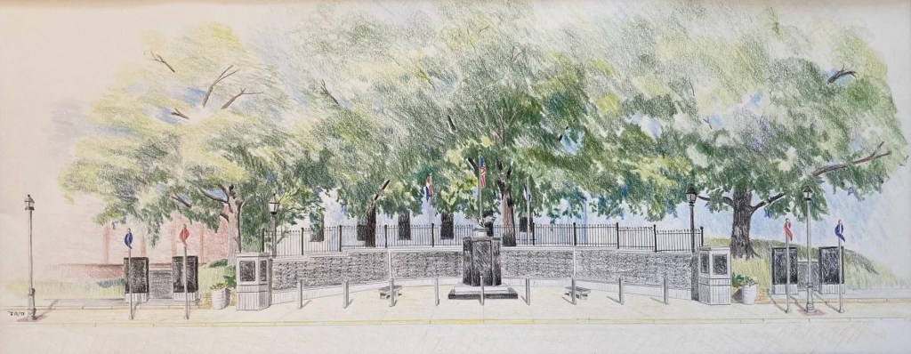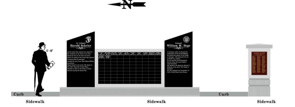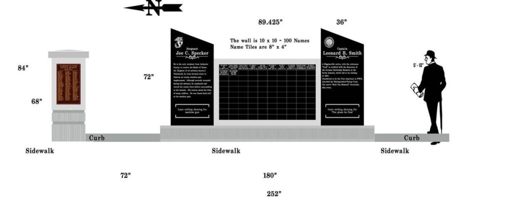 The first phase of the project is to expand the current memorial to include monuments containing information about four individuals from Lafayette county deemed to have made an historic impact on the United States Military’s war efforts. The cover drawing depicts the individual memorials on the north and south sides of the current memorial. The project will include space for the names of 200 additional veterans to be added to the memorial.